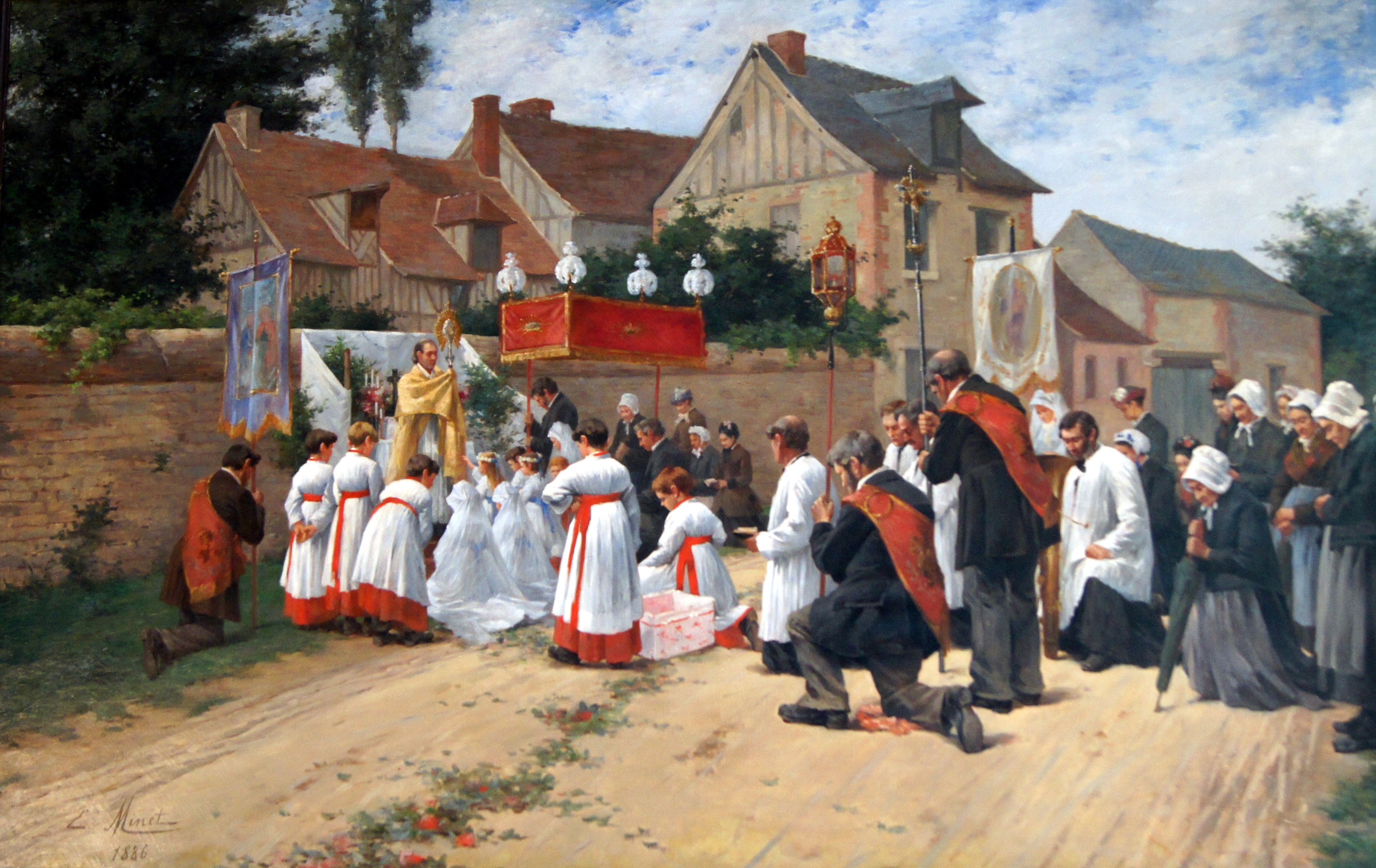 Malgré une similitude de motifs qui parfois l’en rapproche, Minet reste en marge de l’impressionnisme. Il s’inscrit plutôt dans une tradition réaliste, sa « Procession de la Fête-Dieu » faisant songer au célèbre « Enterrement à Ornans », tandis que ses scènes de pêche illustrent le monde du travail. Indices de sa notoriété, l’achat en 1886 par un collectionneur américain de son Retour des moissonneurs, ou la commande en 1894 par un fabricant elbeuvien de panneaux allégoriques sur les thèmes de l’Agriculture et de l’Industrie drapière. Assez renommé désormais pour avoir des élèves Minet va connaître une consécration tardive à Rouen. Sa qualité de peintre, avant tout, du « local », son art éloigné des « extravagances » reprochées alors aux divers novateurs, le font choisir en 1905 comme conservateur du musée des Beaux-Arts. Il le restera jusqu’en 1922, et c’est donc lui qui, en 1909, aura la charge d’accueillir la célèbre donation Depeaux. Il entre en 1917 à l’Académie des sciences, belles lettres et arts de Rouen. Il devait décéder peu après, en 1923. Sa tombe, au Cimetière Monumental de Rouen, mériterait à coup sûr d’être signalée, comme on l’a fait pour d’autres peintres plus novateurs. Car les artistes dits « académiques » pouvaient aussi avoir du talent. Sachons donc redécouvrir un peintre comme Minet, longtemps oublié au fond des réserves mais aujourd’hui remis aux cimaises de nos musées, fût-ce en contrepoint de l’impressionnisme triomphant.