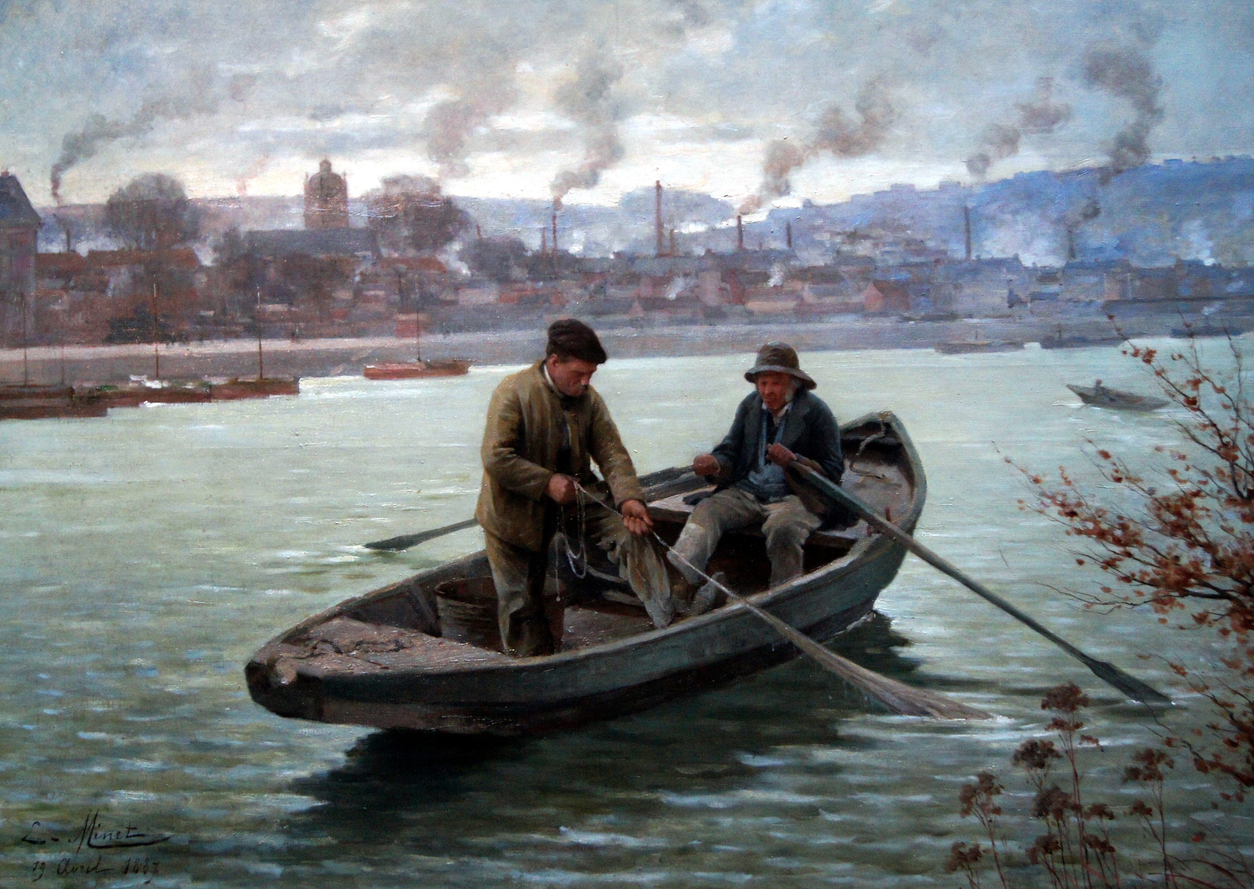 C’est ce qu’il présente en 1874 à l’exposition municipale de Rouen : un « Déjeuner normand » et un « Bouquet de chrysanthèmes », des toiles ne risquant pas de choquer le très académique jury de cette manifestation. Dès lors Minet va se risquer au Salon parisien. En 1876, il y envoie un « Lavoir à Gasny » ou des « Fleurs des champs », qui lui valent un succès d’estime confirmé aux expositions suivantes où ses « Foins de Saint-Aubin » (aujourd’hui au musée de Blois) reçoivent une mention honorable, tandis que son « Appel au passeur » obtient à Rouen la médaille d’or lors du salon de 1886. Sa production, présente notamment dans les musées d’Elbeuf et de Louviers, n’est pas sans caractère répétitif avec ses bouquets un peu convenus (l’un, toutefois, fait penser à Renoir) et ses bords de Seine où des barques transportent paysans ou pêcheurs. Son installation à Freneuse, sur les rives du fleuve entre Elbeuf et Pont-de-l’Arche, ne fera qu’accentuer cette prédilection pour des scènes champêtres au bord de l’eau qu’il présentera encore au Salon parisien dans les années quatre-vingt-dix, des voyages vers l’Afrique du Nord et la Riviera enrichissant un peu son répertoire.
