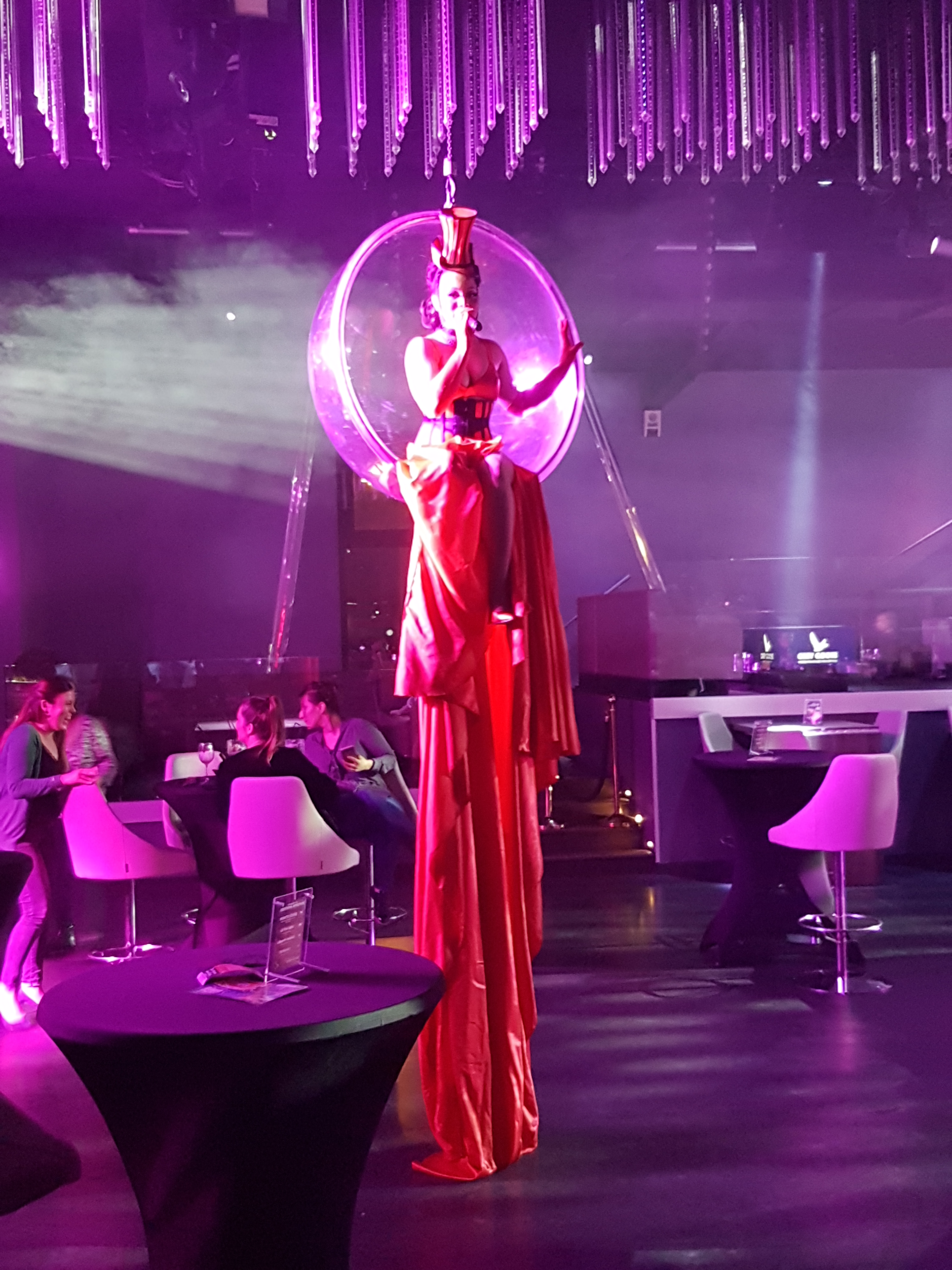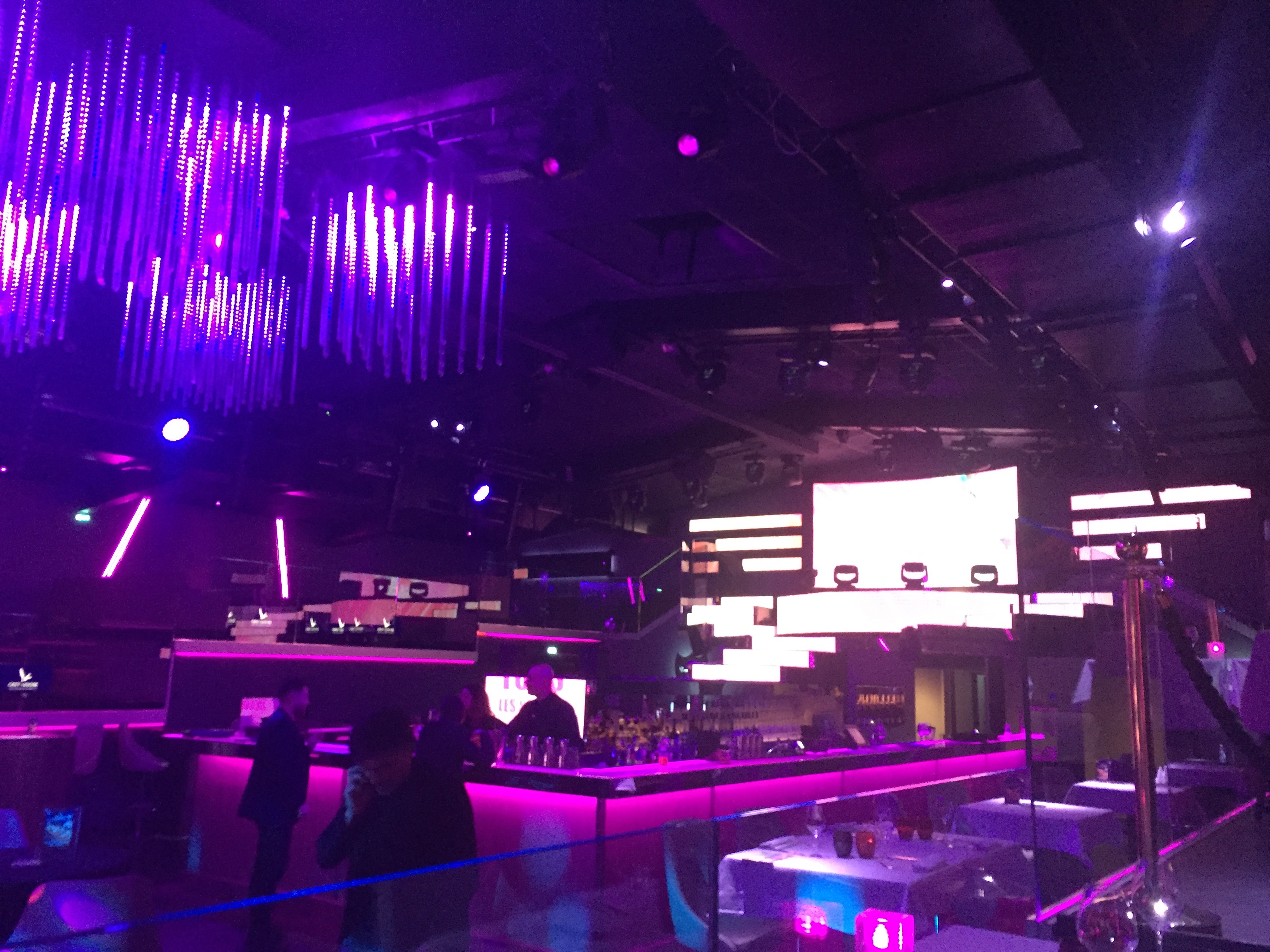 Accueil VIP, talkie-walkie à la main, une charmante hôtesse vous prend en charge sous la tente drapée de noir qui prolonge le hangar revisité. Un côté Jet Set hollywoodien s’empare alors de vous, à mesure que vous montez les marches qui vous conduisent à surplomber la Seine qu’on devine encore malgré la nuit tombante. Passation de témoin, c’est au maître de la salle que vous êtes confiés pour traverser le parterre de tables qui plus tard laisseront place à la piste de danse. Dans une ambiance mi lumières noires, mi tamisée de laquelle se distingue un immense bar à cocktail, encore quelques marches et vous voici dans la partie restaurant en petites terrasses conçues pour voir l’immense scène surélevée qui domine, par-dessus le bar, l’ensemble du club.