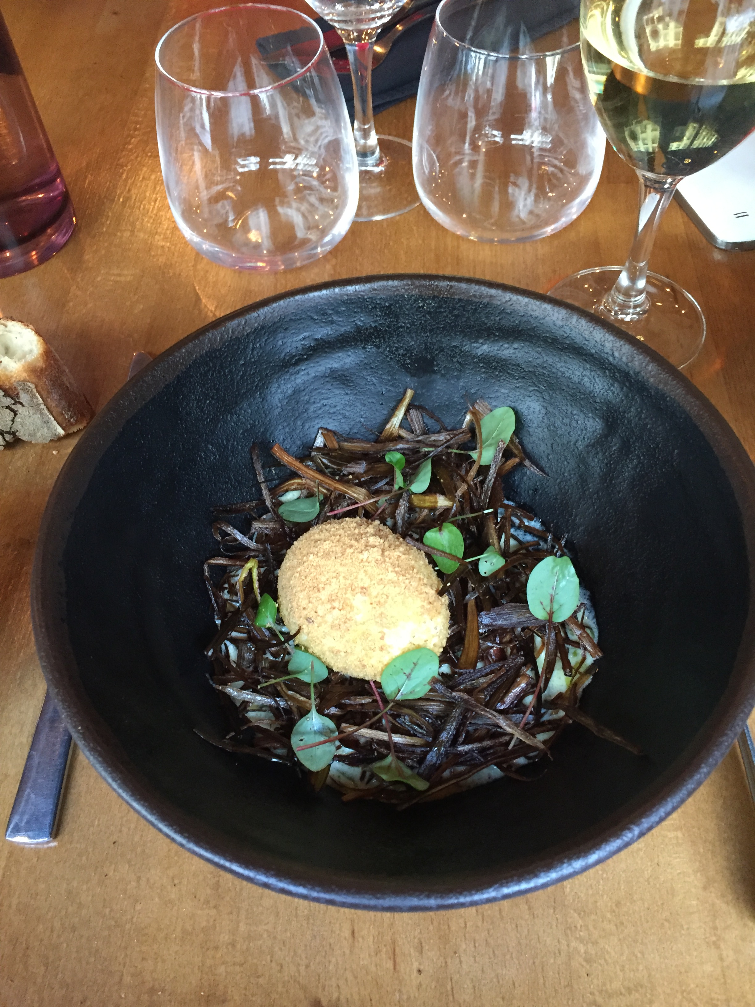 Les inspecteurs du guide Michelin aiment employer l’expression « cuisine inventive » à tel point qu’on imagine qu’ils sont à court d’imagination pour imager ce qu’ils ont mangé. Mais là, dans l’assiette il y a plus qu’inventivité. Ce serait presque une cuisine intellectuelle. Au sens étymologique, elle se lit de l’intérieur tant il y a de richesses et de subtilités qui tissent un mille-feuille de saveurs et de textures. Elle se déguste, mais pour qui s’attarde à ce qui se passe en bouche, il y a cette même complexité subtile qu’une gorgée de vin. C’est particulièrement vrai pour les entrées et par exemple le nid de poireaux œuf poché. L’œuf est là, le poireau est là, mais outre le fait que l’œuf soit parfaitement poché ne laissant rien du trop cuit ou du pas assez, et bien que le poireau soit un petit peu brûlé toutefois, l’impression de paille en bouche est saisissante et l’œuf qui s’écoule comme le liant du nid fait de son parfum et de celui du poireau une création éphémère que le gras de l’œuf maintient pourtant en bouche quelque temps au-delà de la dernière bouchée. La complexité se faire encore plus subtile pour l’œuf Bénédicte, toujours aussi parfaitement poché, et son avocat fondant. Un va et vient en bouche d’autant plus déroutant que le gras de l’œuf comme de l’avocat se portaient presqu’en s’atténuant délicatement sur une version très étudiée de croque-monsieur panaïs. Mais ce n’est pas la trouvaille inventive qui ravit les papilles et l’esprit, c’est l’équilibre de l’ensemble en une seule bouchée, comme s’il s’était agi d’un seul aliment, d’une seule consistance, d’une saveur unique diffractée en autant d’ingrédients. Ces entrées ne sont pas seulement inventives, elles sont construites, pensées, préparées, comme un acteur répète son spectacle.