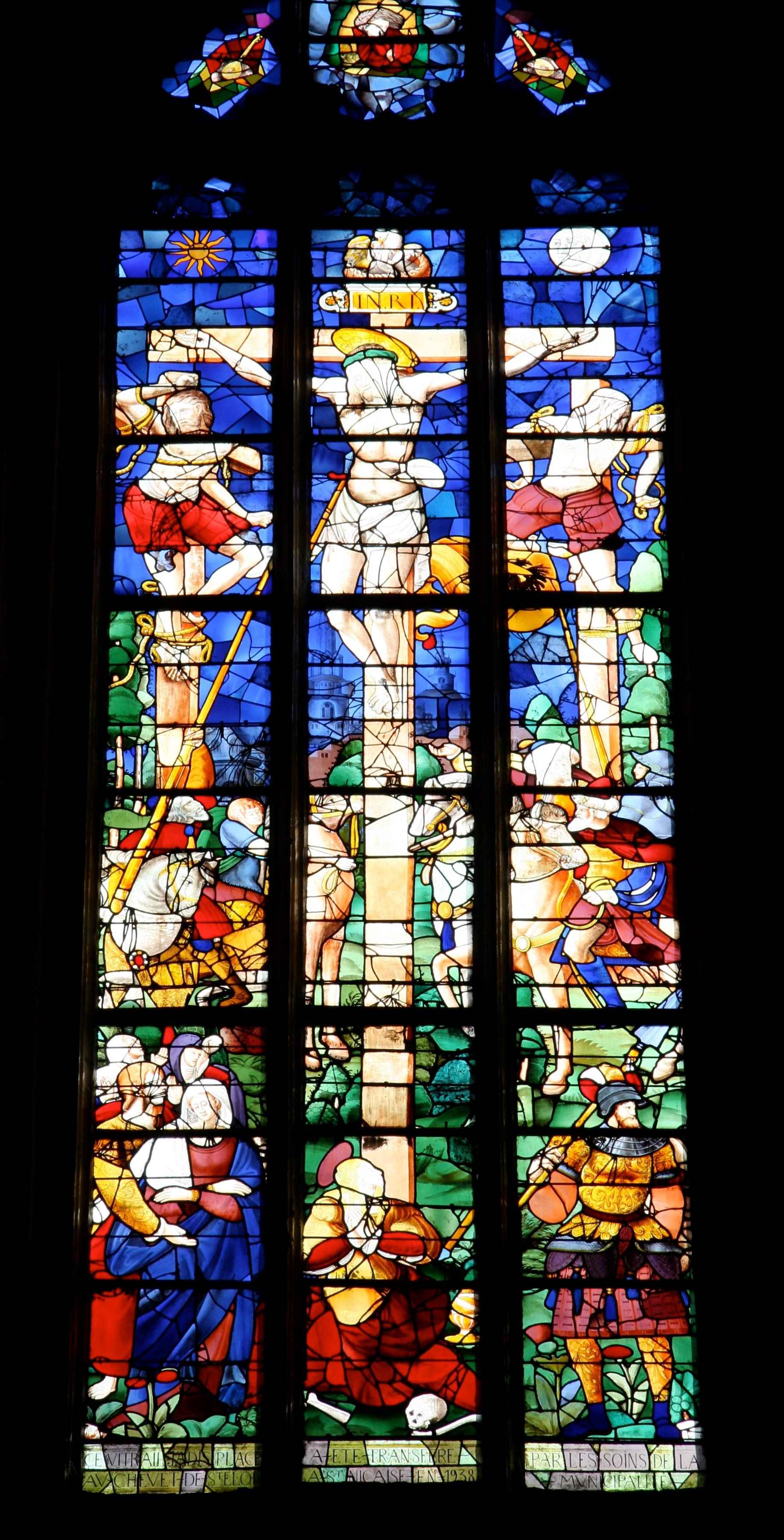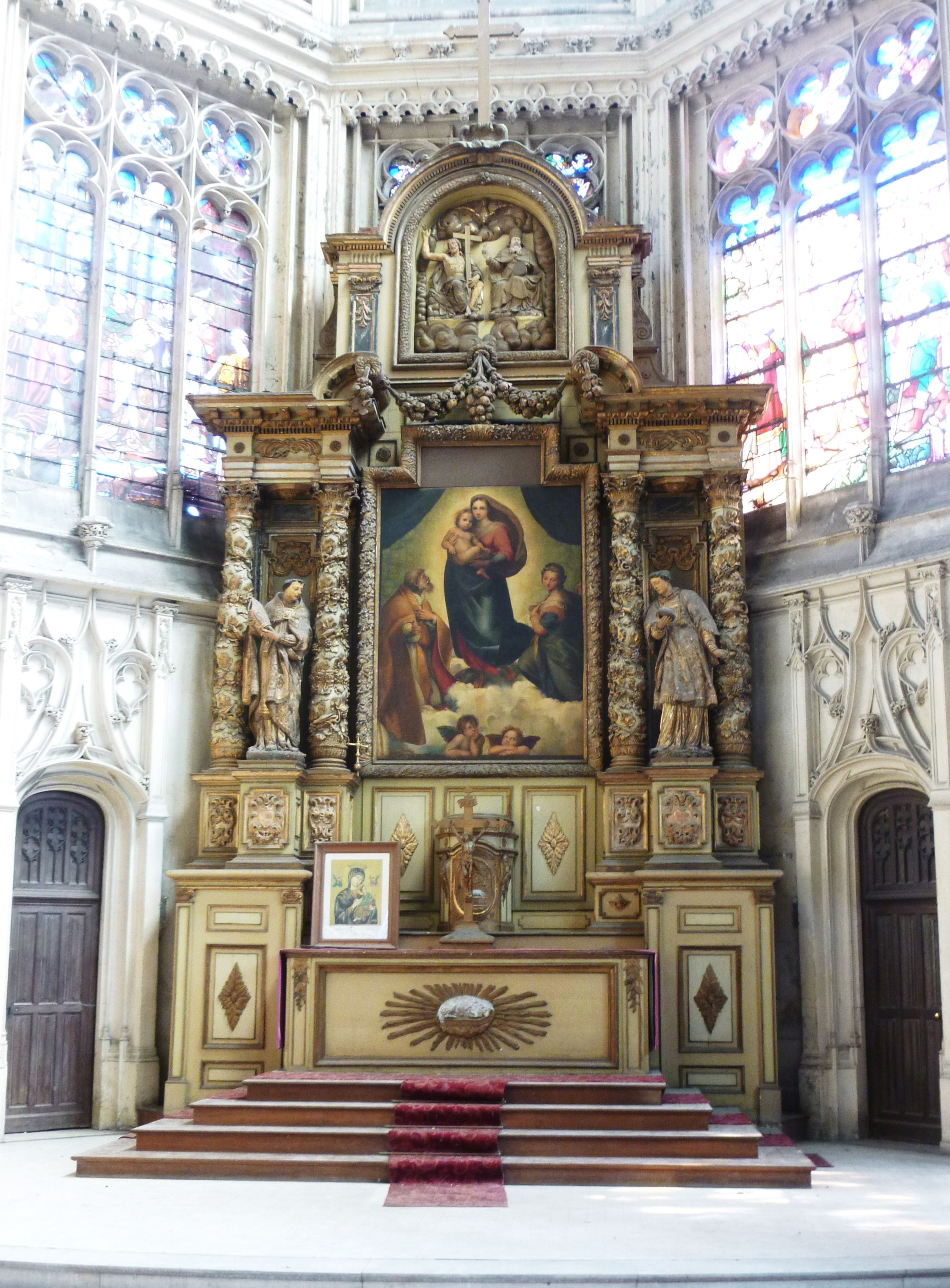 L’originalité de cette église, inscrite en 1981 à l’Inventaire supplémentaire des monuments historiques, est d’associer harmonieusement cette architecture pionnière à un très beau chœur gothique conservé, flanqué de bas-côtés, avec une abside à trois pans qu’illuminent d’immenses fenêtres hautes. Un emplacement de choix pour des vitraux anciens qui, pour une part, ont survécu à l’incendie, tel celui des Vertus cardinales, datant de 1555. La superbe verrière axiale, également XVIe siècle, de la Crucifixion est, elle, un judicieux remontage, provenant de l’ancienne église Saint-Eloi et installé ici en 1938. Mais l’ornement le plus somptueux du chœur est sans doute l’imposant retable baroque dû à Etienne Mazeline, en 1658, où dans un jeu de colonnes torses à décor végétal, les statues des martyrs saint Nicaise et saint Quirin encadrent le tableau, d’après Raphael, de la Vierge à l’Enfant.