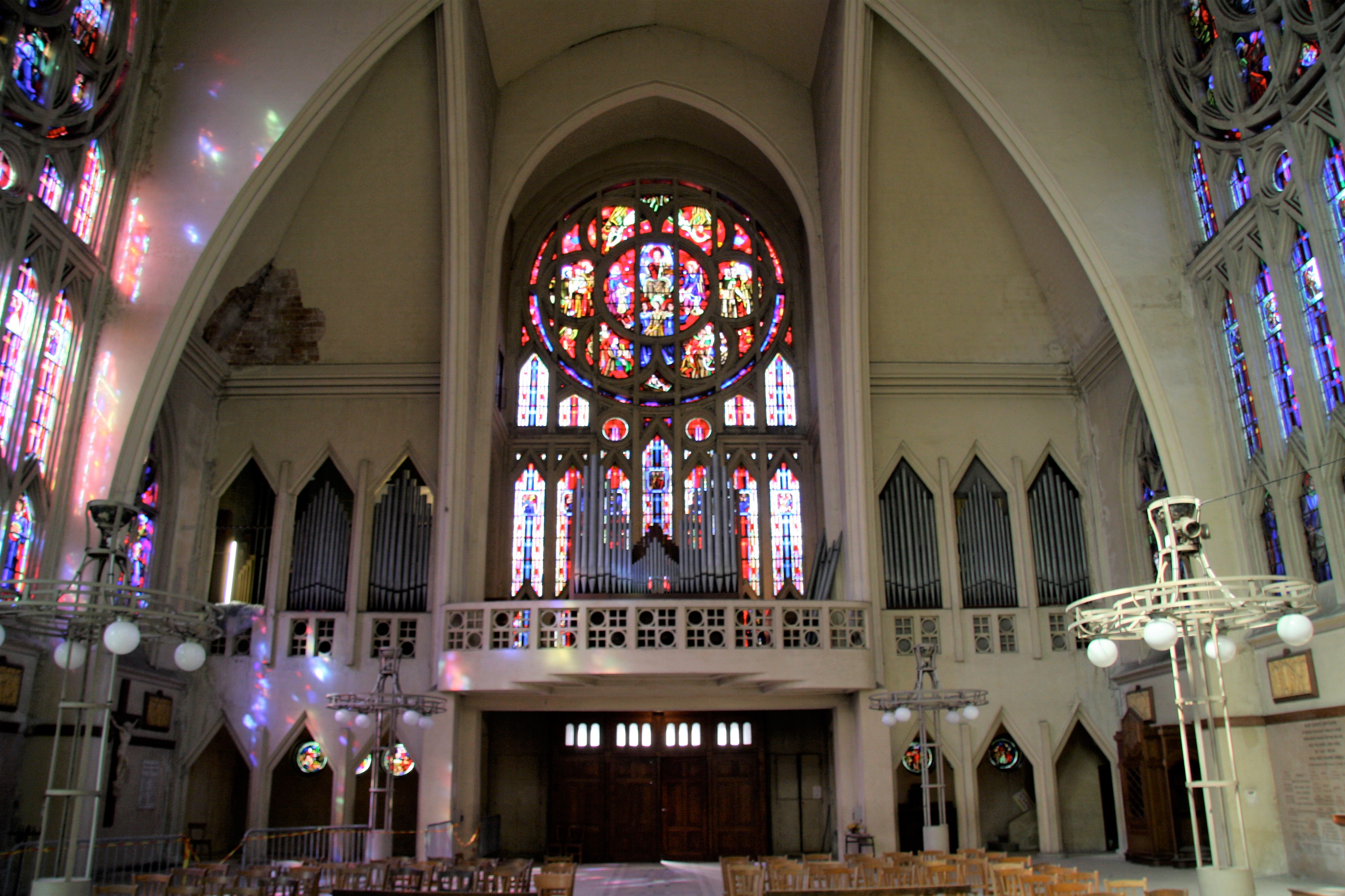 L’incendie qui en mars 1934 ravage l’édifice, n’épargnant que le chœur et ses bas-côtés, est d’autant plus durement ressenti. On comprend que sa reconstruction, confiée à l’architecte Pierre Chirol et rapidement engagée ait été suivie de près par la population du quartier et que sa réouverture, dans le lourd contexte de 1940, ait été perçue comme un symbole d’espérance à travers sa modernité affichée. Car la nouvelle façade et la nouvelle nef greffée sur la partie gothique subsistante sont résolument novatrices, tant dans leur matériau – le béton armé – que dans les audaces que celui-ci permet. Ainsi, à l’intérieur, avec l’ample vaisseau d’une hauteur désormais égale à celle du chœur, où d’immenses arcs brisés délimitent une lumineuse coupole, transposition des traditionnelles tours-lanternes de nos églises médiévales, tandis que de larges claires-voies surmontées de roses art déco s’offrent à l’épanouissement de modernes verrières, œuvres de Max Ingrand : à l’ouest, au-dessus d’un grand orgue remplaçant celui du XVIIe siècle malheureusement détruit par l’incendie, c’est une représentation du Jugement dernier ; au nord, c’est la Glorification de saint Antoine de Padoue ; sur le vitrail sud figurant le Sacré Cœur, on a intégré le visage des deux pères de cette reconstruction, Pierre Chirol et son adjoint Emile Gaillard. D’autres vitraux encore illustrent la Multiplication des pains ou encore de charmants Anges musiciens.