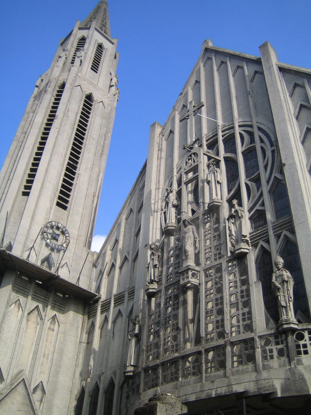 A l’extérieur, cette partie nouvelle de l’édifice, rythmée de lignes verticales qui en soulignent l’envolée, présente en façade un gable peuplé de statues de saints et saintes dues à divers sculpteurs. Hors-œuvre, à l’angle nord-ouest, un clocher orné de huit anges en béton s’achève en flèche ajourée à 60 m. du sol, portant un remarquable ensemble de cloches.