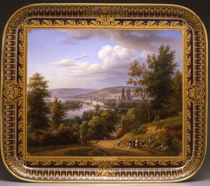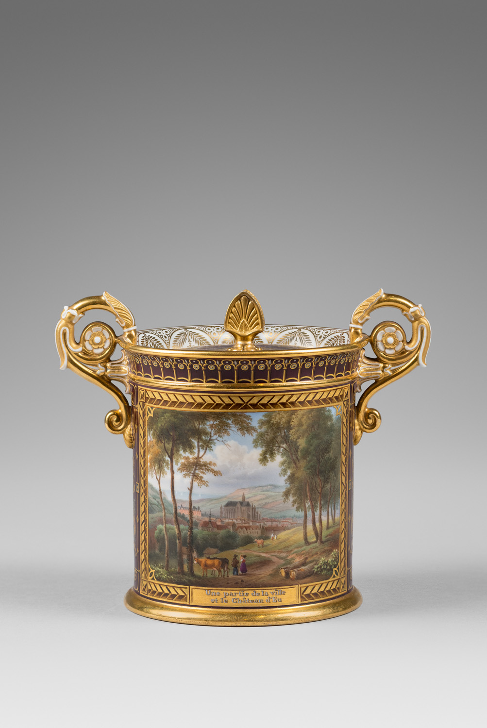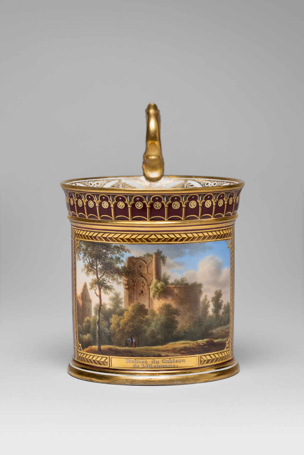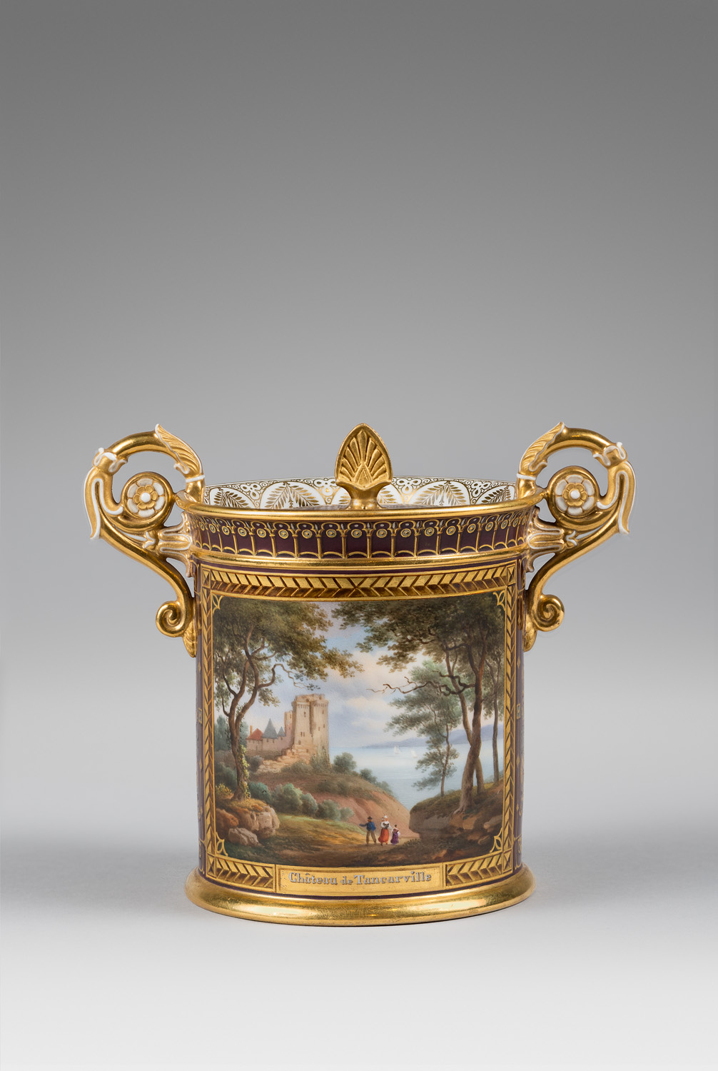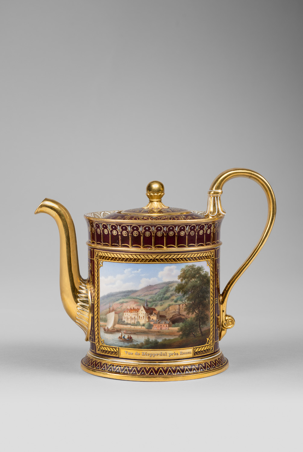 Exceptionnel, unique, rarissime, royal, sublime, historique ! Les qualificatifs se bousculent sur les lèvres balbutiantes du visiteur éberlué qui ne sait plus si tant de laudatifs reviennent au service à thé ou à son retour en France. La beauté de l’ensemble réhausse le détail d’une œuvre sans précédent par son histoire, comme par son programme iconographique. Qu’un roi souhaite offrir à la reine un service à thé de la Manufacture de Sèvres, n’a en soi rien d’original et toutes les pièces de ce type de commande rivalise/nt assurément de finesse et de beauté. La rareté, va de soi pour une pièce unique et sur mesure. Pourtant, ce service à thé, commandé par Louis-Philippe pour la reine Marie-Amélie en 1837, est bien exceptionnel. On ne sera pas surpris que la Manufacture ait mis sur le projet son meilleur peintre, Jean-Baptiste Gabriel Langlacé (1786-1864), spécialisé dans les vues topographiques. On le sera plus par le choix des représentations qui ont conduit le peintre à se déplacer en Normandie, au lieu de se contenter de reproduire l’une ou l’autre gravure existante. C’est ainsi que Langlacé croqua des vues de Rouen et des environs, aussi réalistes que surprenantes. En ce début de XIXe siècle, la Normandie exerce déjà un attrait particulier sur les âmes romantiques. Les ruines, les paysages verdoyants, les falaises sont autant de muses pour les artistes qui transmettent au public parisien et aux élites françaises, le goût d’une Normandie romantique dont l’héritage nourrit, aujourd’hui encore, touristes et amateurs d’art. La famille royale est, elle-même, très attachée à la région. L’un des princes, les plus célèbres, est titré duc d’Aumale. Mais par-dessus tout, le château d’Eu berce de souvenirs heureux les enfants royaux, comme leur père. C’est donc en hommage à peine voilé que l’une des tasses représente la villégiature estivale de celui qui restera l’unique « roi des Français ». La finesse et la richesse des décors peignant aussi bien des vues rouennaises que des alentours forcent l’admiration et confèrent comme une plénitude de paix, à l’image d’une promenade bucolique sur les bords de seine.