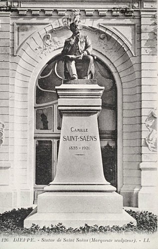 De plus, à lire les lettres et à déchiffrer les cartes postales de ce compositeur adressées à son éditeur parisien Durand, il est aisé de dire que, dès avril 1889, Saint-Saëns passait régulièrement la belle saison sur la côte dieppoise. Fait rarissime dans la vie d’un artiste, le musicien avait eu l’insigne gloire, en 1907, de participer à l’inauguration de sa propre statue dans sa ville d’adoption. Il s’agissait d’une sculpture en bronze exécutée par Marqueste et représentant l’artiste assis (l’œuvre était érigée devant le théâtre, elle a été fondue par l’occupant en 1942).