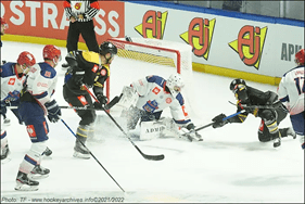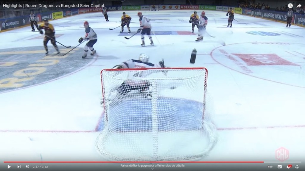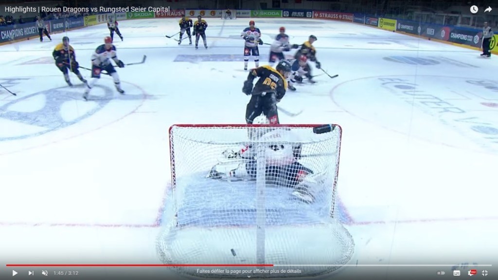 Runsgted débutait le 3e tiers par une nouvelle faute après 20 s. puis une nouvelles 24 s. plus tard. De nouveau, les Rouennais se retrouvaient à 5 contre 3. Cette fois-ci, c’est Tessier (n° 90) qui se chargeait d’alourdir le score par un tir limpide dans la lucarne côté droit (4-1). Les joueurs de Rungsted sortaient alors complètement de leur match et Gammelgaard écopait d’une pénalité majeure (5 min. + pénalité de match) pour une charge dangereuse au niveau de la tête sur le Rouennais Gilbert (n° 67). A la suite de la décision arbitrale, les esprits s’apaisaient et le rythme de la fin de match se faisait en gestion. Rungsted avait visiblement abandonné tout espoir de revenir dans le match et les Dragons se contentaient de ne pas se mettre en danger. Seul Gilbert (n° 67) réveillait la patinoire par un tir pleine lucarne (5-1). La soirée s’achevait sur ce score et le public pouvait être ravi du très beau spectacle offert par les Dragons. En attendant, grâce à cette victoire, Rouen revenait à la 2e place du classement de sa poule et a désormais son destin en main en attendant le match retour à Runsgted mardi 12 octobre.