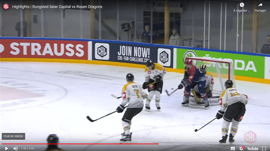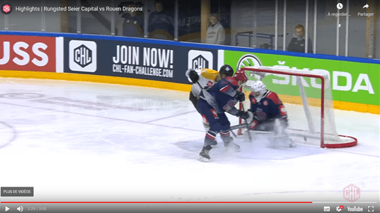 Rungsted se montrait très menaçant dans ce début de 3e tiers. Les Dragons voyaient même un palet longer dangereusement la cage à quelques centimètres de Pintaric. Fort heureusement, l’attaquant de Rungsted placé juste devant le but, ne parvenait pas à tromper Pintaric, très sollicité sur cette action, qui s’y reprenait à 3 fois pour geler le palet. Après un excellent travail sur la bande, Joris Bedin (n° 37) parvenait à libérer le palet pour Andrew Johnston (n° 61) qui arrivait lancé côté droit et transmettait le palet juste devant la cage à Rolands Vigners (n° 91) qui détournait le palet dans le but entre les jambes du gardien (2-3). Malgré quelques occasions dangereuses, Runsteg ne parvenait plus à imposer son jeu sur cette fin de match. Rouen se payait même le luxe d’inscrire un dernier but en cage vide grâce à Kelsey Tessier (n° 90) (2-4). Rouen tenait alors sa qualification pour les 8es de finale de la CHL obtenue, comme en 2018, par une dernière victoire à l’extérieur.