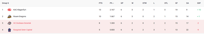 Résultat final du Groupe G : Klagenfurt et Rouen se qualifie pour les 8es de finale.