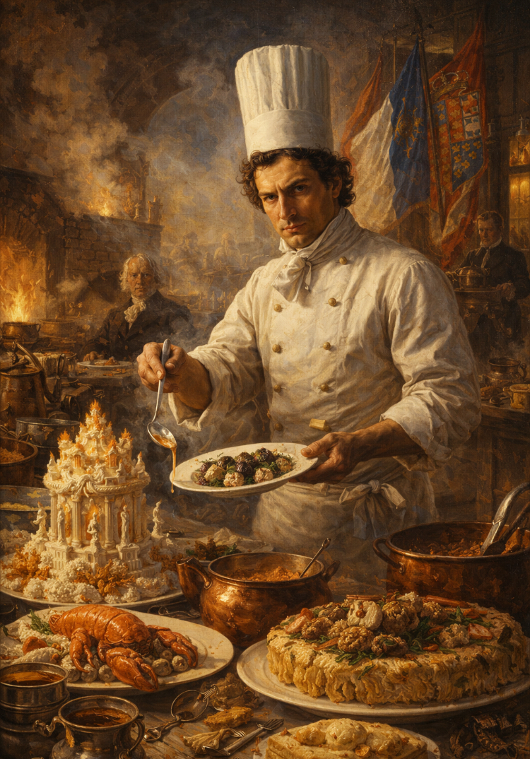Déjà reconnu comme maître pâtissier grâce à ses pièces montées spectaculaires, Carême déploie alors un talent tout aussi ingénieux dans ses entrées, ses plats, et surtout dans ses sauces, qui subjugueront bientôt l’Europe entière.