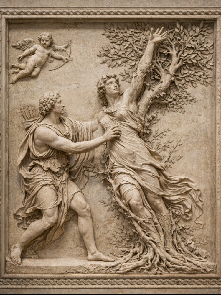 Daphné, dans le premier livre des Métamorphoses, est une nymphe vouée à la chasse et au refus de l’amour ; poursuivie par Apollon, enflammé d’un désir qu’elle ne partage point, elle fuit non par caprice, mais par fidélité à sa nature même. Sa course n’est donc pas seulement un mouvement physique : elle est une résistance, une manière d’être au monde qui se maintient dans l’éloignement, dans la distance, dans la continuité d’un refus.